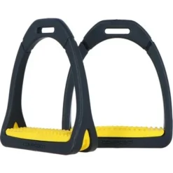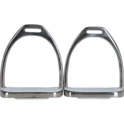 De brede roestvrijstalen antislip beugelzool heeft een grof profiel en extra lange gaten voor de afvoer van zand en water. De beugelzool is licht gekanteld, zodat de hak omlaag wordt gehouden. De afgeschuinde stijgbeugelriemophanging zorgt voor een goede beugelpositie, waardoor de voet in de juiste positie gehouden wordt. Dit geeft de ruiter meer stabiliteit en verbetert de beenligging.