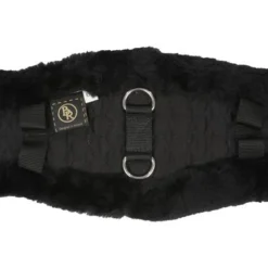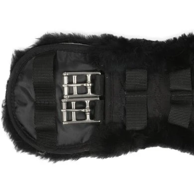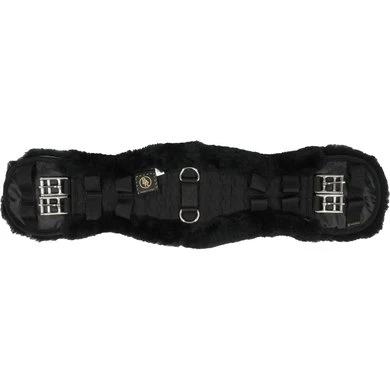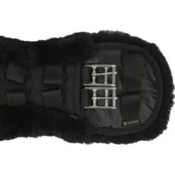 Anatomisch gevormde dressuursingel met medicinale schapenvacht. Vanwege de gebogen vorm kan de elleboog vrij bewegen, waardoor beschadigingen aan de huid kunnen worden voorkomen. Met roestvrijstalen gespen en D-ringen voor het bevestigen van eventuele hulpteugels.