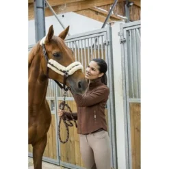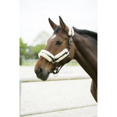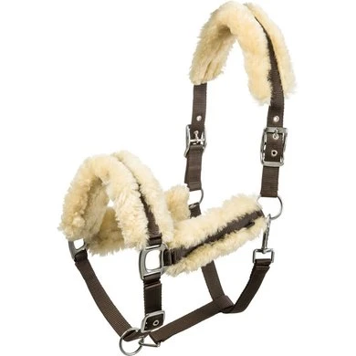 Van zeer zachte dubbeldik polypropyleen met het kopstuk, de bakstukken en neusriem gevoerd met synthetisch schapenvacht. Kopstuk is dubbel verstelbaar met gespen en versterkte oogjes. Keelriem met snelsluiting. Solide vernikkelde metalen gespen.