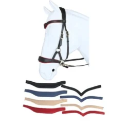 Met een V-shape frontriem, nekstuk anatomisch gevormd, neusriem breed aflopend, high density foam in de nek, neus en frontpadding welke verwisselbaar is van kleur, inclusief 18 mm softleder teugels met clips