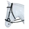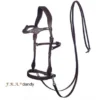 F.R.A. bitloos systeem 5: bitloze optomingen zijn niet nieuw! Eeuwenlang werd een bitloze optoming als vanzelfsprekend ervaren, voordat er ooit aan werd gedacht iets in de mond van het paard te stoppen legde de mens er simpelweg iets omheen. Een touw als halster was destijds voldoende en zo ontstond de eerste bitloze optoming. In combinatie met de ondersteunende gewichts-,been- en gevoelshulpen onderhoudt de ruiterhand via de teugels kontakt, niet met de mond, maar met het hoofd van het paard. Werkingsprincipe: druk op neus, nek èn wangen, nek/kingekruiste teugelvoering. Bouw: De lederen neusriem van deze optomingen, in de markt veelal bekend onder systeem Cook, is aan beide zijden even achter de bakstukken voorzien van een ring. Door deze ringen loopt een soepele lederen riem kruislings over de kin, via de kaken over de nek. Aan beide uiteinden van deze riem worden de gespen of clips van de teugeluiteinden bevestigd. Aan de linkerzijde van het hoofdstel vind je één gesp voor de bakstukafstelling en één gesp voor het verbinden van de kruislingse riemen. Ter bescherming van het nekgebied zijn beide riemen daar met een zachte padding onderlegd. De riemen dienen zodanig door de passanten van deze nekpadding verschoven te worden dat ze aan beide zijden gelijke lengte hebben. De gesp van de kinriem is de enige gesp die nodig is om het hooofdstel op het hoofd te fixeren. Ligging: Evenals bij de meeste bitloze optomingen geldt ook voor deze optomingen dat de neusriem op het harde gedeelte van de neus moet liggen, ongeveer daar waar het neusbeen begint. De kinriem mag gevoelsmatig ’te’ vast, maar beslist niet aangesnoerd zijn. Dit om verdraaiïng van het hoofdstel te voorkomen. De bakstukken van bitloze hoofdstellen met een kin- nekgekruist systeem zullen altijd de neiging hebben enigszins op te bollen. Inwerking: