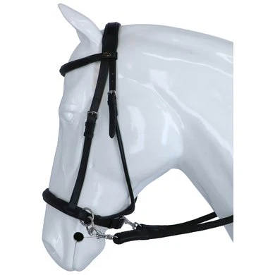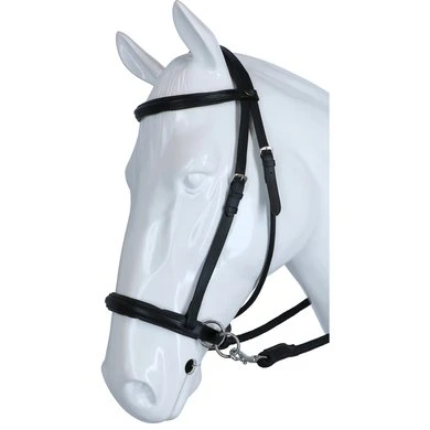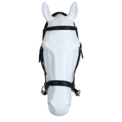 F.R.A. bitloos systeem 5: bitloze optomingen zijn niet nieuw! Eeuwenlang werd een bitloze optoming als vanzelfsprekend ervaren, voordat er ooit aan werd gedacht iets in de mond van het paard te stoppen legde de mens er simpelweg iets omheen. Een touw als halster was destijds voldoende en zo ontstond de eerste bitloze optoming. In combinatie met de ondersteunende gewichts-,been- en gevoelshulpen onderhoudt de ruiterhand via de teugels kontakt, niet met de mond, maar met het hoofd van het paard. Werkingsprincipe: druk op neus, nek èn wangen, nek/kingekruiste teugelvoering. Bouw: De lederen neusriem van deze optomingen, in de markt veelal bekend onder systeem Cook, is aan beide zijden even achter de bakstukken voorzien van een ring. Door deze ringen loopt een soepele lederen riem kruislings over de kin, via de kaken over de nek. Aan beide uiteinden van deze riem worden de gespen of clips van de teugeluiteinden bevestigd. Aan de linkerzijde van het hoofdstel vind je één gesp voor de bakstukafstelling en één gesp voor het verbinden van de kruislingse riemen. Ter bescherming van het nekgebied zijn beide riemen daar met een zachte padding onderlegd. De riemen dienen zodanig door de passanten van deze nekpadding verschoven te worden dat ze aan beide zijden gelijke lengte hebben. De gesp van de kinriem is de enige gesp die nodig is om het hooofdstel op het hoofd te fixeren. Ligging: Evenals bij de meeste bitloze optomingen geldt ook voor deze optomingen dat de neusriem op het harde gedeelte van de neus moet liggen, ongeveer daar waar het neusbeen begint. De kinriem mag gevoelsmatig ’te’ vast, maar beslist niet aangesnoerd zijn. Dit om verdraaiïng van het hoofdstel te voorkomen. De bakstukken van bitloze hoofdstellen met een kin- nekgekruist systeem zullen altijd de neiging hebben enigszins op te bollen. Inwerking: