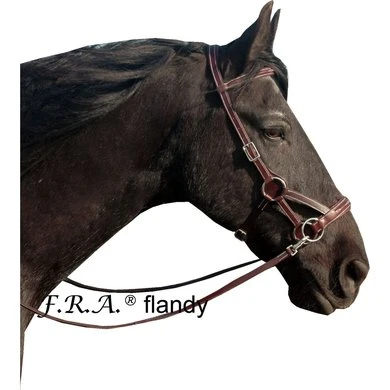 Touwknoophalsters: Touwknoophalsters zijn er in vele varianten en uitvoeringen, de F.R.A.® nh touwknoophalsters kenmerken zich door een veelvoud van maatvoeringen in de dikten 6, 7 en 8mm. Naast een basic uitvoering, de Babia, in 3 maten vind je een 6mm uitvoering, de Capal, in 5 maten en een 7mm uitvoering, de Pablo, in 3 maten. De laatste twee uitvoeringen zijn voorzien van een nubuck, resp. lederen nek- en neusbescherming en zijn gericht op professioneel gebruik. Juist de maatvoering van een knoophalster speelt een zeer belangrijke rol, het halster dient juist, zonder veel speling, aansluiting te vinden op het paardenhoofd. Ligging: Zoals bij alle bitloze optomingen geldt ook voor de sidepull en voor het knoophalster, dat de neusriem op het harde gedeelte van de neus moet liggen, ongeveer daar waar het neusbeen begint. De kinriem van de sidepull uitvoering mag gevoelsmatig ’te’ vast, maar beslist niet aangesnoerd zijn. Dit om verdraaiïng van het hoofdstel te voorkomen. Inwerking:Sidepull: Letterlijk vertaald betekent het woord sidepull : ’zijwaarts trekken’. Dat doet deze optoming dan ook, het van de hals afbrengen van de hand (openen) heeft tot gevolg dat de combinatie van de verbinding van het bakstuk naar de neusriem via beide riempjes en ring druk uitoefent op de tegenovergestelde wang: wendingen. Het vragen van de teugel (ophoudingen) heeft een discriminerende hulp van druk op de neus tot gevolg, hetgeen resulteert in tempowisselingen en òf halthouden. Dit uiteraard in combinatie met overige ondersteunende hulpen. Het hoofdstel leent zich tot normaal longeren uitsluitend met gebruik van een longeerbril. De longeerbril haakt u in de ringen waar normaal de teugels worden vastgemaakt. Voor het longeren aan de dubbele lijnen en pessoa longeren gebruikt u dezelfde ringen. (beschikbare modellen F.R.A.® pardoes en F.R.A.® shango)