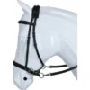 F.R.A. bitloos systeem 4: bitloze optomingen zijn niet nieuw! Eeuwenlang werd een bitloze optoming als vanzelfsprekend ervaren, voordat er ooit aan werd gedacht iets in de mond van het paard te stoppen legde de mens er simpelweg iets omheen. Een touw als halster was destijds voldoende en zo ontstond de eerste bitloze optoming. In combinatie met de ondersteunende gewichts-,been- en gevoelshulpen onderhoudt de ruiterhand via de teugels kontakt, niet met de mond, maar met het hoofd van het paard. Werkingsprincipe: druk op neus en wangen, kingekruiste teugelvoering. Bouw: In dit systeem eindigt de neusriem aan beide zijden met een ring waaraan de bakstukken en de beide kinkruisriemen zijn bevestigd. Deze riemen vinden hun kruisgeleiding door een ring aan het einde van een kort stukje leder dat op zich dan weer aan de ringen van de neusriem is bevestigd. Gevolg is dat het kruislingse geheel wat lager hangt dan bij kaakgekruiste optomingen (zie systeem 5). Aan de uiteinden van de kruisriemen worden de teugels bevestigd. Verder is dit hoofdstel eenvoudig in uitvoering door het ontbreken van een frontriem, een keelriem en de stoot en gesp die we normaal op een neusriem aantreffen. Aan de linkerzijde vind je een gespverbinding in het bakstuk, het is de enige gesp, die nodig is om het hoofdstel op maat te maken. Éénmaal op maat, dan schuif je het hoofdstel van dit systeem simpelweg op het paardenhoofd waarna je niets meer hoeft vast te maken. Voor de serie F.R.A.® katoenen hoofdstelen uit systeem 4 geldt in essentie het hier beschrevene, uiteraard is er in die lijn van hoofdstellen geen sprake van gespverbindingen of andere op leder betrekking hebbende omschrijvingen. Ligging: Evenals bij de meeste bitloze optomingen geldt ook voor de hoofdstellen uit systeem 4, dat de neusriem op het harde gedeelte van de neus moet liggen, ongeveer daar waar het neusbeen begint. De bijzondere bouw van deze hoofdstellen zorgen voor een goede en vaste ligging op het paardenhoofd zonder dat je iets behoeft vast te maken. Inwerking: De kingekruiste riemen zorgen ervoor dat wanneer je links of rechts vraagt, het paard druk aan de andere kant op neus en wang krijgt en vervolgens de hand van de ruiter volgt: wendingen dus als gevolg van druk. Gelijktijdige ophoudingen aan beide teugels sluiten de neusriem en geven mogelijkheden tot halthouden of tempowisselingen. Het genoemde vragen van linker, rechter of beide teugels zal door de indirecte teugelvoering altijd een bepaalde mate van dosering in zich hebben, het is deze dosering die de mate van discriminerende inwerking bepaald. Dit heeft tot gevolg dat een gewenste wijziging in de mate van discriminatie altijd in een vloeiend effect tot stand zal komen. Vanzelfsprekend worden teugelhulpen ondersteund met overige ondersteunende hulpen. Het verbindigsriempje dat de teugelgeleidering aan de neusriem en het bakstuk verbindt zorgt voor een lage ligging en vrije doorvoer van de kruislingse kinkruisriemen hetgeen de release zeer ten goede komt. Extra aandacht bij dit type hoofdstellen zal altijd moeten worden gegeven aan het onderhoud van de gekruiste kinriemen, het juiste onderhoud zal het leder de soepelheid geven om in de ringen de juiste release blijvend te kunnen ondervinden. Het hoofdstel leent zich niet tot longeren met de enkele longe en daardoor dus ook niet tot pessoa longeren. Voor het longeren aan de dubbele lijnen neemt u de teugels af en gebruikt u de vrijkomende ringen voor het bevestigen van de lange lijnen. Geschiktheid: De optoming wordt in combinatie met licht teugelcontact gebruikt en is zeer geschikt voor gevoelige paarden. Daardoor leent de optoming zich ook in het bijzonder voor in te rijden jonge paarden en hoog in het bloed staande gevoelige dieren, in die categorie is het hoofdstel ook als menhoofdstel te gebruiken. Naast dat het hoofdstel als leidhalster te gebruiken is geeft het tevens volledige mondvrijheid hetgeen op buitenritten zijn voordeel kan bieden.