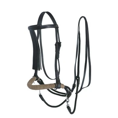 F.R.A. bitloos systeem 4: bitloze optomingen zijn niet nieuw! Eeuwenlang werd een bitloze optoming als vanzelfsprekend ervaren, voordat er ooit aan werd gedacht iets in de mond van het paard te stoppen legde de mens er simpelweg iets omheen. Een touw als halster was destijds voldoende en zo ontstond de eerste bitloze optoming. In combinatie met de ondersteunende gewichts-,been- en gevoelshulpen onderhoudt de ruiterhand via de teugels kontakt, niet met de mond, maar met het hoofd van het paard. Werkingsprincipe: druk op neus en wangen, kingekruiste teugelvoering. Bouw: In dit systeem eindigt de neusriem aan beide zijden met een ring waaraan de bakstukken en de beide kinkruisriemen zijn bevestigd. Deze riemen vinden hun kruisgeleiding door een ring aan het einde van een kort stukje leder dat op zich dan weer aan de ringen van de neusriem is bevestigd. Gevolg is dat het kruislingse geheel wat lager hangt dan bij kaakgekruiste optomingen (zie systeem 5). Aan de uiteinden van de kruisriemen worden de teugels bevestigd. Verder is dit hoofdstel eenvoudig in uitvoering door het ontbreken van een frontriem, een keelriem en de stoot en gesp die we normaal op een neusriem aantreffen. Aan de linkerzijde vind je een gespverbinding in het bakstuk, het is de enige gesp, die nodig is om het hoofdstel op maat te maken. Éénmaal op maat, dan schuif je het hoofdstel van dit systeem simpelweg op het paardenhoofd waarna je niets meer hoeft vast te maken. Voor de serie F.R.A.® katoenen hoofdstelen uit systeem 4 geldt in essentie het hier beschrevene, uiteraard is er in die lijn van hoofdstellen geen sprake van gespverbindingen of andere op leder betrekking hebbende omschrijvingen. Ligging: Evenals bij de meeste bitloze optomingen geldt ook voor de hoofdstellen uit systeem 4, dat de neusriem op het harde gedeelte van de neus moet liggen, ongeveer daar waar het neusbeen begint. De bijzondere bouw van deze hoofdstellen zorgen voor een goede en vaste ligging op het paardenhoofd zonder dat je iets behoeft vast te maken. Inwerking: De kingekruiste riemen zorgen ervoor dat wanneer je links of rechts vraagt, het paard druk aan de andere kant op neus en wang krijgt en vervolgens de hand van de ruiter volgt: wendingen dus als gevolg van druk. Gelijktijdige ophoudingen aan beide teugels sluiten de neusriem en geven mogelijkheden tot halthouden of tempowisselingen. Het genoemde vragen van linker, rechter of beide teugels zal door de indirecte teugelvoering altijd een bepaalde mate van dosering in zich hebben, het is deze dosering die de mate van discriminerende inwerking bepaald. Dit heeft tot gevolg dat een gewenste wijziging in de mate van discriminatie altijd in een vloeiend effect tot stand zal komen. Vanzelfsprekend worden teugelhulpen ondersteund met overige ondersteunende hulpen. Het verbindigsriempje dat de teugelgeleidering aan de neusriem en het bakstuk verbindt zorgt voor een lage ligging en vrije doorvoer van de kruislingse kinkruisriemen hetgeen de release zeer ten goede komt. Extra aandacht bij dit type hoofdstellen zal altijd moeten worden gegeven aan het onderhoud van de gekruiste kinriemen, het juiste onderhoud zal het leder de soepelheid geven om in de ringen de juiste release blijvend te kunnen ondervinden. Het hoofdstel leent zich niet tot longeren met de enkele longe en daardoor dus ook niet tot pessoa longeren. Voor het longeren aan de dubbele lijnen neemt u de teugels af en gebruikt u de vrijkomende ringen voor het bevestigen van de lange lijnen. Geschiktheid: De optoming wordt in combinatie met licht teugelcontact gebruikt en is zeer geschikt voor gevoelige paarden. Daardoor leent de optoming zich ook in het bijzonder voor in te rijden jonge paarden en hoog in het bloed staande gevoelige dieren, in die categorie is het hoofdstel ook als menhoofdstel te gebruiken. Naast dat het hoofdstel als leidhalster te gebruiken is geeft het tevens volledige mondvrijheid hetgeen op buitenritten zijn voordeel kan bieden.