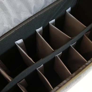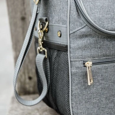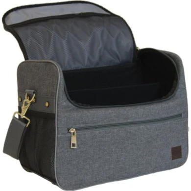 De binnenkant van de tas is aanpasbaar met sterke klittenband verdelers. Hierdoor kan je de tas perfect aanpassen aan jouw noden. In het hoofdvak kan je borstels, sprayflacons en andere poetsspullen opbergen. Aan de binnenflap kan je kleinere items opbergen in een apart vak. Aan de voorkant van de tas is een groot vak waar je spullen zoals elastiekjes, naald en draad kan opbergen. Aan beide kanten is ook nog een rekbaar mesh zakje. De poetstas sluit met een sterke rits en heeft een verwijder- en aanpasbare schouderband voor makkelijk en comfortabel transport. De zijkanten van de tas zijn versterkt zodat het extra sterkte en bescherming biedt aan de borstels. De poetstas is 42,5 cm x 32,5cm x 20cm (L x H x B).