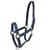 Soepel aanbind halstertouw voor kopschuwe paarden van polypropyleen met musketon met paniekhaaksluiting van gesatineerd grijs zink.