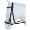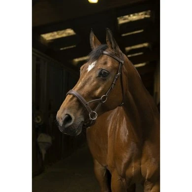 Side-pull van buffelleer. Front- en neusriem gevoerd met rundleer. Witte stiksels. Roestvrijstalen gesp. Verkocht zonder teugels.