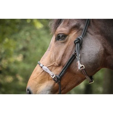 Halster van leer en touw. Verstelbare neusriem. Knoopbevestiging aan de zijkant van het hoofd. Glijring voor halstertouw. 2 leren delen op de neusriem. Geen band tussen neus- en keelriem om de druk achter de oren te verminderen. Muskaton aan de keelriem.