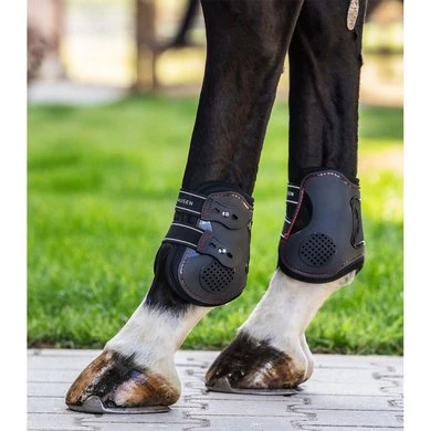 Anatomisch gevormde buitenschaal met ventilatiegaten. Schokabsorberende vulling door middel van speciaal gecoat keramisch materiaal met vulling van traagschuim. 3x verstelbaar, praktische snelle knoopsluiting met elastische banden voor een optimale pasvorm. Rode, stijlvolle contrasterende naden. Paar